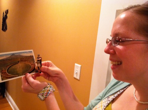 We each ate a slice of pizza and made our way down to the Pompeii exhibit by 1:30. Phenomenal! It reminded me of touring a museum in Greece. Seeing the artifacts up close…most of the styles were mimics of Greek art anyway. Pompeii was a Roman city during Emperor Vespasian. The city was filled with temples to the gods, mostly to Baccus–the god of wine and vegetation–because the area was very fertile there with grapes, olives, grains. Also, Neptune–the god of the sea and Apollo–god of the sun were very popular, but you saw mamy different statues. During the exhibit, there were also a lot of fauns.