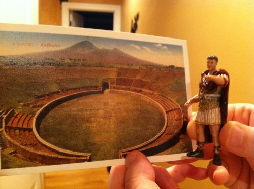 The displays were set up like you were walking through a section or street of town. They showed how they did laundry (definitely not how we do it today…be thankful someone invented bleach!); their markets, how they cooked, their private rooms, how they bathed (extremely clean people…the women even wore makeup!); the amphitheatre with gladiators and their armor; the house structures and gardens. They even had a system of pipes to bring clean water into the house while another section of the pipe went out to their gardens. Their foyer areas when you walked in the house set the tone of the house. One had a tile art of a dog and the inscription said, “Beware of the dog.” Interesting, huh!? I think the house structures were my favorite to learn about. They even had a pool in that front foyer area that would collect rain water. They had artifacts of all things: pots, pans, wine vessel, water buckets, dentist and doctor tools, jewelry, mirrors, garden statues and pillars, and statues of the gods. To think all this and the people were frozen in time all these years.