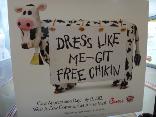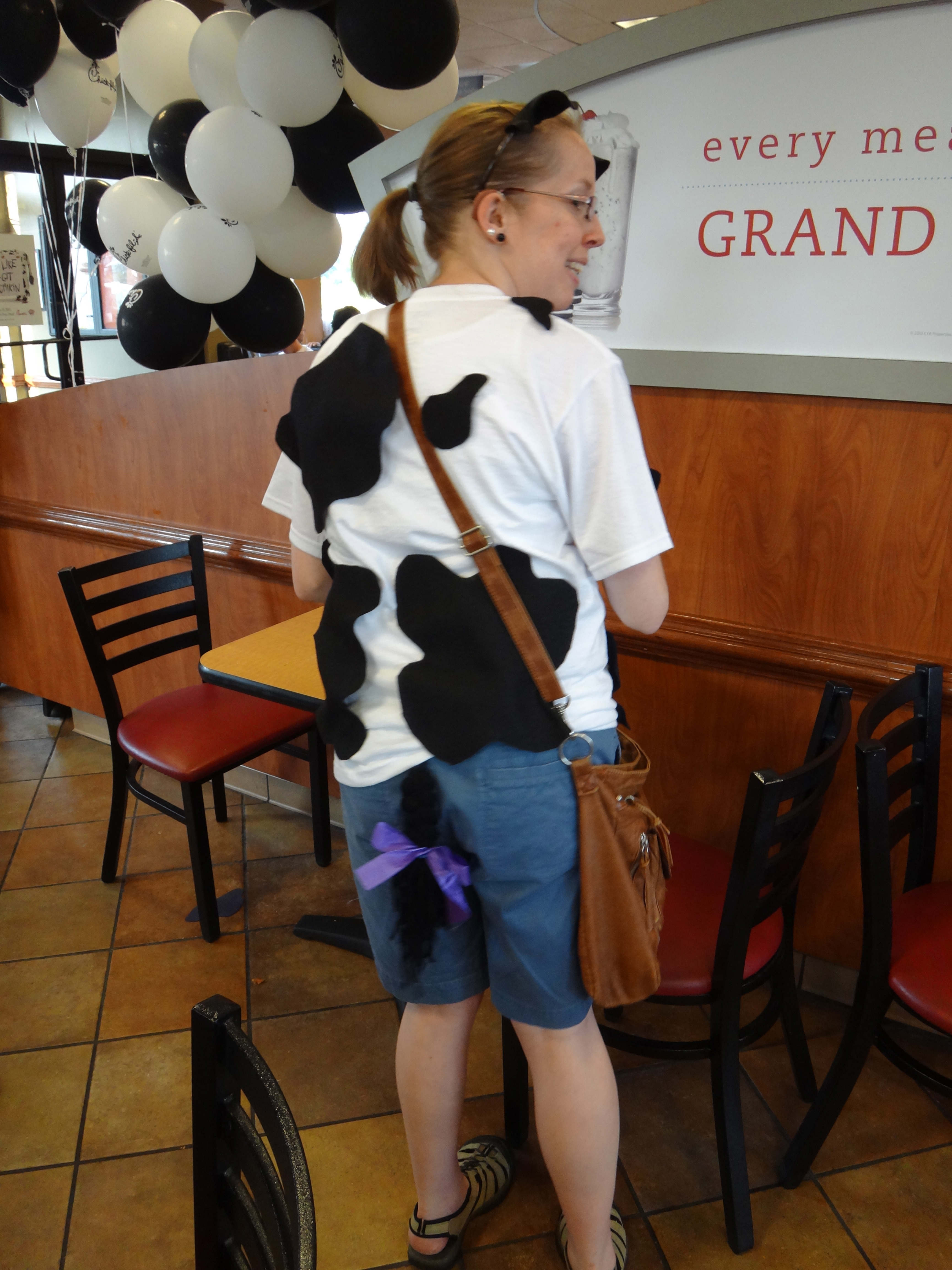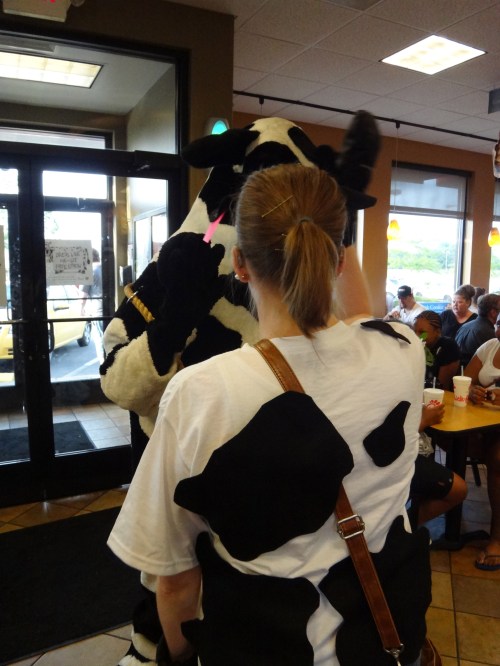 Yes siree, Friday was none other than Cow Appreciation Day, hosted by Chic Fil A. We were supposed to “moo” in this picture, but I did not hear that part–hence my smile. Of course, Dad went as Farmer Brown. At least the people found great humor in it. 🙂