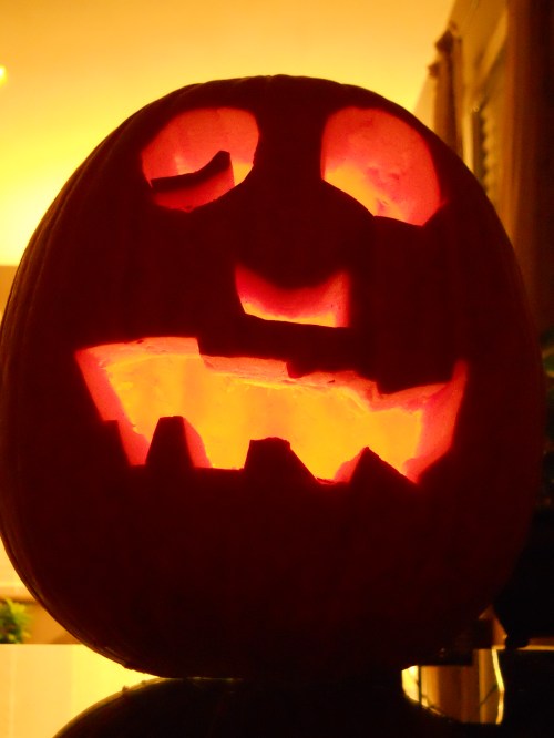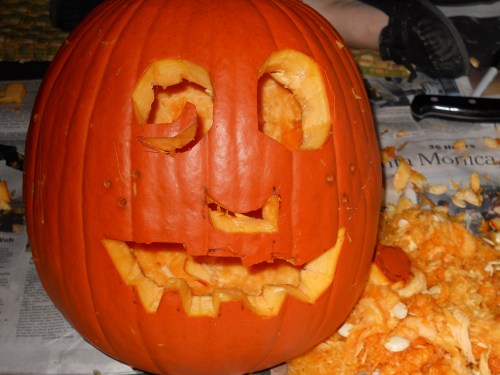 Do you like pumpkins? I decided to write down all my favorite things associated with pumpkins: Pumpkin pies, frozen pumpkin pie (scrumptious!!!); “It’s the Great Pumpkin, Charlie Brown!” [you can watch clippings on YouTube or you can easily find it in stores at this time of year]; fall decorations with pumpkins. I think I might attempt to paint something fall-ish with a big pumpkin somewhere in the midst of it. I would rather paint something creative with fall colors than carve. Last time I carved a pumpkin, my sister and I had to rotate shifts. Carving is not so easy on big pumpkins. But it was fun and it turned out well, not to mention, the seeds are quite the treat!!! 😀 Note the lack of top teeth was my carving abilities. 🙂