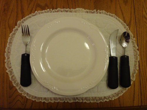 Yesterday before dinner, I asked Mom to carry my laptop for me back to my room–a brilliant request as I was losing my grip on many other things during the evening…in particular, circular objects like my biscuit full of apricot jam and cylinder shaped objects like my Hazelnut creamer as I was pulling it from the refrigerator shelf. It fell to the floor, lid cracked, and about what I would blend in three cups of coffee spilled on the floor. It was the grand finale to my day.